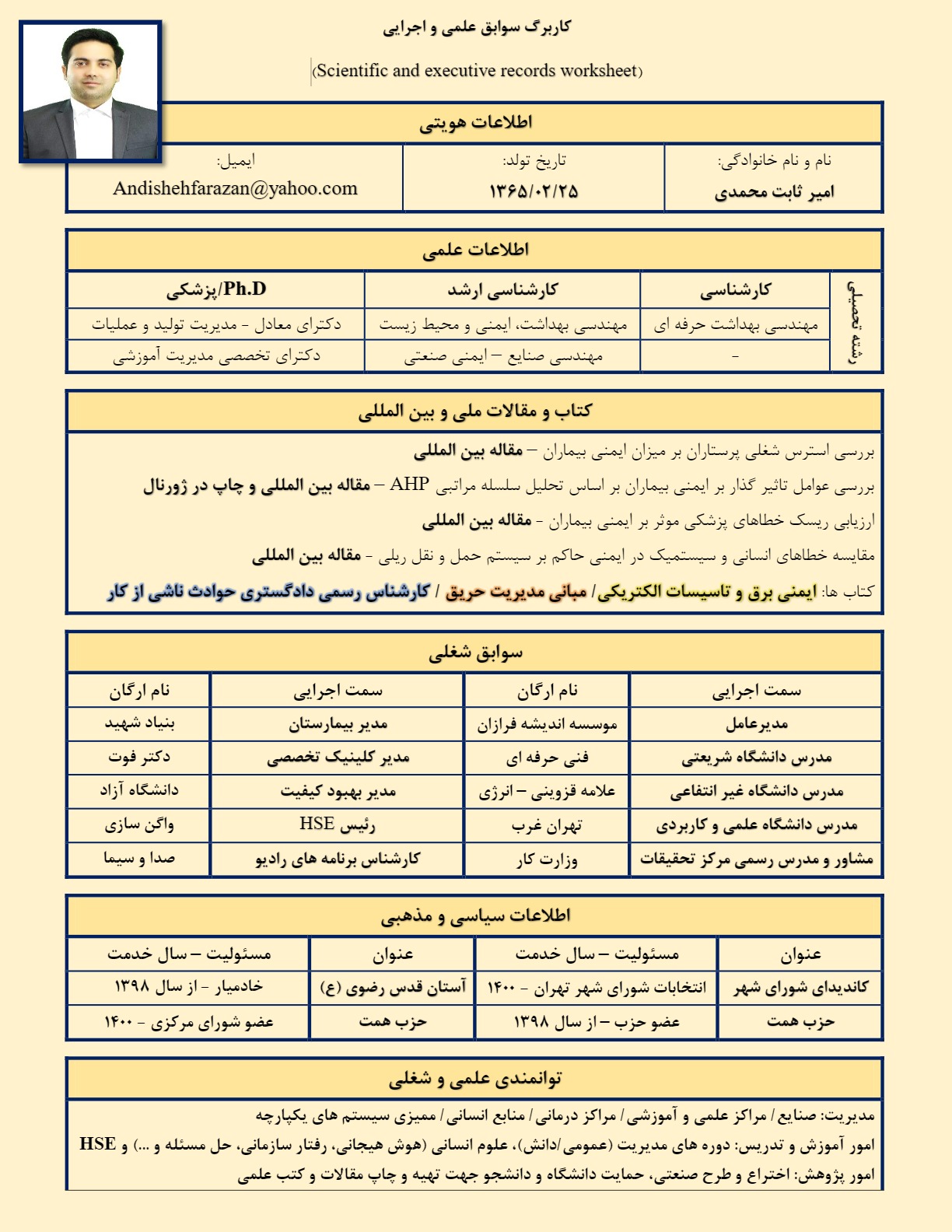 امیر ثابت محمدی متولد سال 1365 مدیر عامل شرکت اندیشه فرازان و مدرس دانشگاه در رشته های HSE، مهندسی ایمنی صنعتی و مدیریت می باشد. وی از سال 1387 در صنعت توزیع نیروی برق کار خود را در حوزه HSE آغاز نمود. سپس از سال 1390 به عنوان مدیر HSE در صنایع فولاد مشغول فعالیت بود و از سال 1391 در حوزه بهداشت و درمان از جمله مدیریت بیمارستان، مدیریت کنترل کیفیت، مدیریت IPD، مدیریت کلینیک های تخصصی و ... فعالیت های خود را ادامه داد. ایشان در حوزه های ایمنی، مدیریت، استقرار سیستمها و ... در دانشگاه فنی و حرفه ای، دانشگاه علمی کاربردی، دانشگاه های غیر انتفاعی، جهاد دانشگاه خواجه نصیرالدین طوسی، جهاد دانشگاه علوم پزشکی تهران و موسسات خصوصی و بین المللی، دوره های آموزشی و سمینارهای علمی برگزار می نماید و حضور فعال در رسانه ملی و شبکه های صدا و سیما به عنوان کارشناس برنامه دارد.